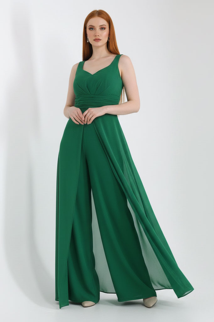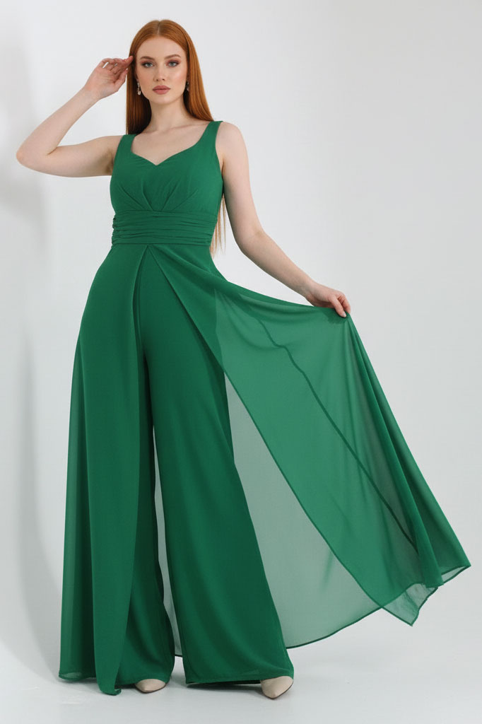 Зелен шифонен гащеризон с широки крачоли „Green Aria“