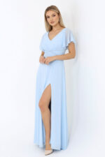 ❄️ Ледена кралица. Моделът „Sky Crystal“ е въплъщение на нежността. Светлосиният цвят напомня за приказката „Замръзналото кралство“. Ефирните ръкави и коланът с кристали създават въздушен и магичен образ. Цепката на полата добавя щипка женственост към този невинен силует.