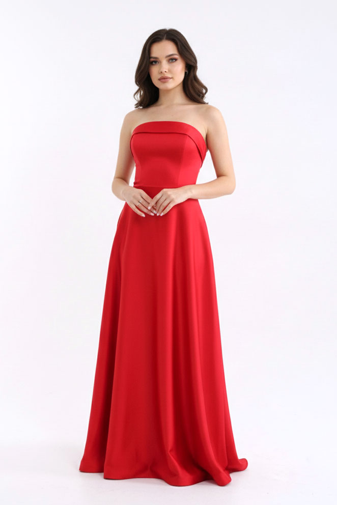 🌹 Дамата в червено. Моделът „Red Grace“ е класика, която спира дъха. Няма нищо по-силно от жена в дълга червена рокля. Сатенът в огнен нюанс превръща всеки повод в холивудска премиера. Корсетът оформя безупречна осанка, а дългата пола се движи величествено с вас.